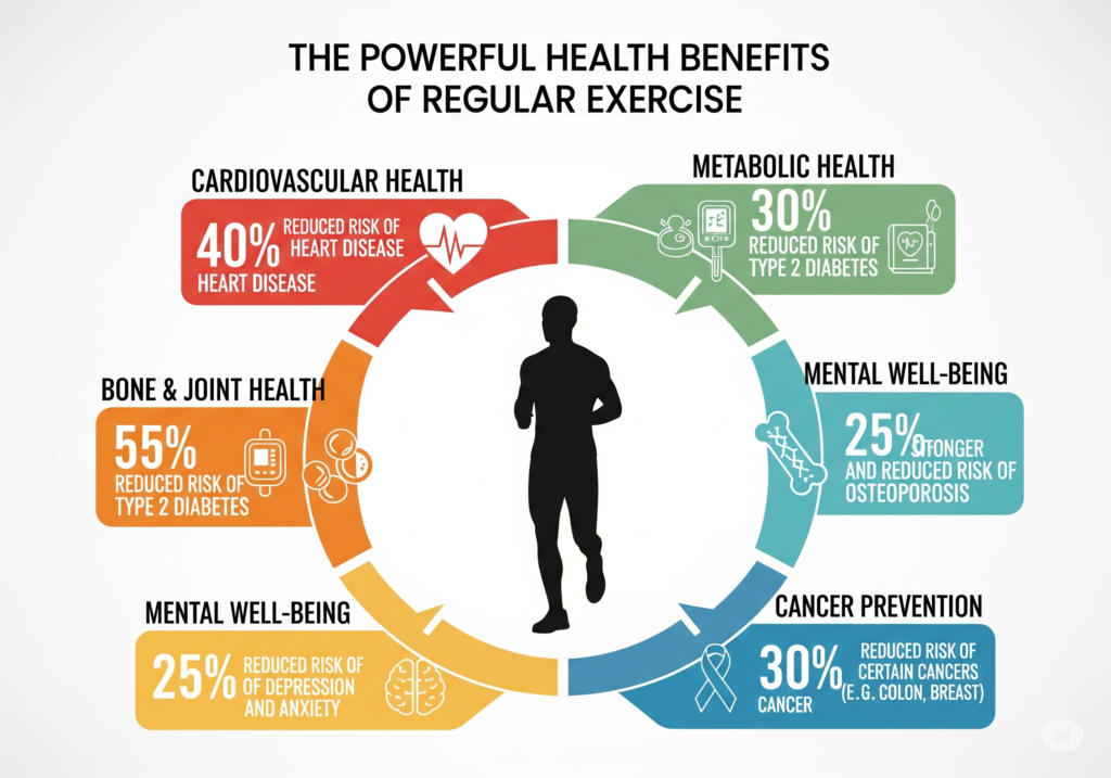 Regular exercise reduces cardiovascular disease risk through multiple mechanisms. It strengthens the heart muscle, improves blood vessel function, and optimizes blood pressure. Even modest activity—as little as one hour of walking per week—provides significant cardiovascular protection.